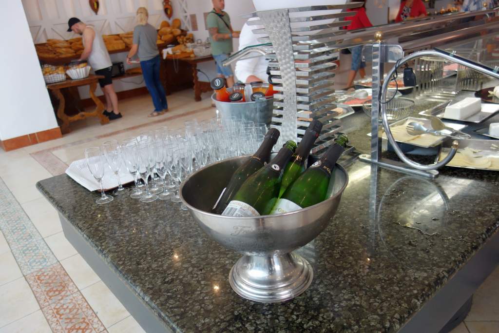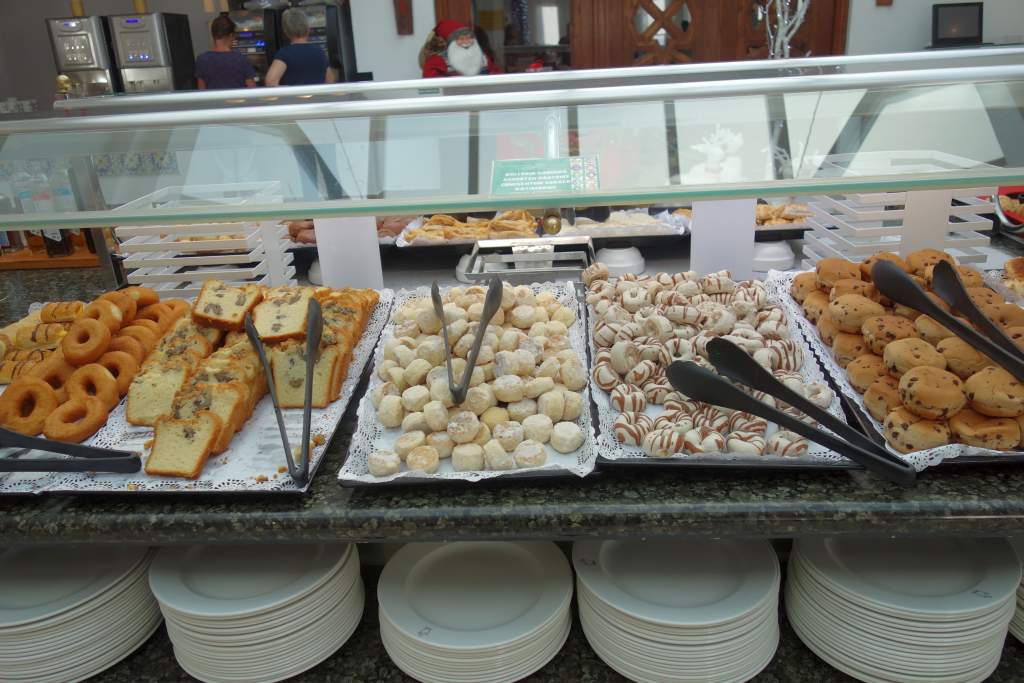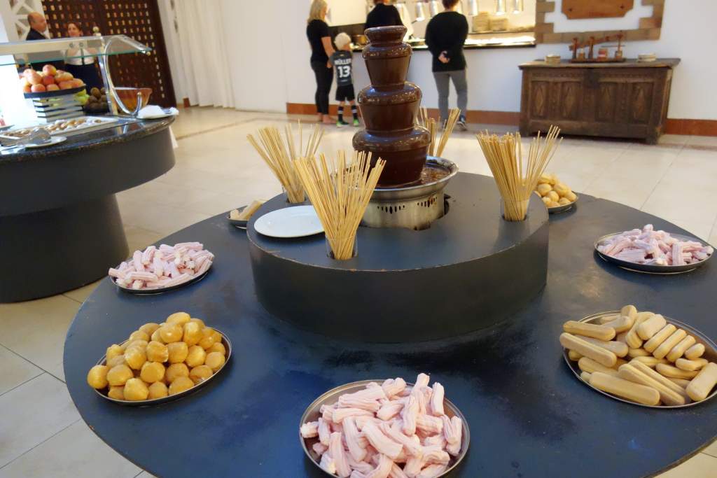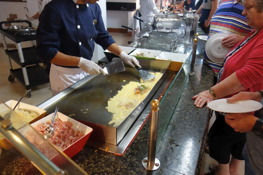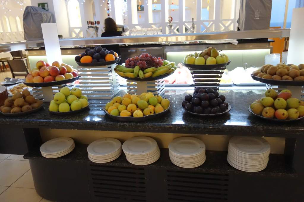 Frühstück gab es von 7:30-10:00 Uhr und wir kamen selten vor 9:00 Uhr, eigentlich nur am Tag des Ausflugs in den Norden nach Lobos. Die Auswahl war groß, da gab es Süßes ebenso wie kräftiges, beides warm oder kalt. Wer sich bewusst ernähren wollte, der fand frische und getrocknete Früchte, Müsli und Joghurt. Ich bevorzugte als Einstieg meist ein Spiegelei mit einem Rösti, danach Brot und Käse und zum Abschluss ein kleines Schoko-Muffin oder einen kleinen Panvake mit Nutella. Elke schaffte es sogar, weiße Bohnen oder Gemüse zu verzehren und meist begann der Tag für sie auch noch mit einem Gläschen Sekt.