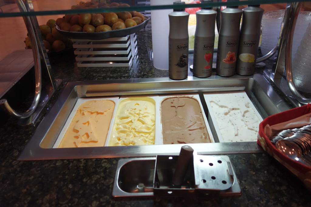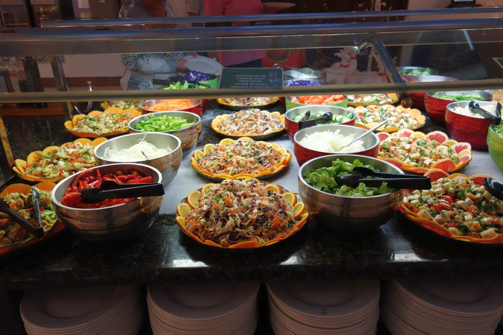 Das Buffet am Abend war von 18:00-21:00 Uhr geöffnet und meist standen wir schon bei der Eröffnung pünktlich vor der Tür. Das Abendbuffet war sehr umfangreich, wie die Bilder zeigen. An manchen Abenden gab es zusätzlich noch Speisen aus einem Wok und oft eine Weinprobe. Wir aßen zwar sehr viel Gemüse und Fisch, kaum Fleich und wir nahmen auch weithehend Abstand von der Pizza und Pasta, aber die Auswahl war einfach zu verführerisch, man aß einfach zu viel. Ich hielt anfangs auch Abstand vom Süßen, aber irgendwann entdeckte ich doch das Schoko-Eis und die Sahnebällchen, die man am Schokoladenbrunnen verfeinern konnte. Danach war dies für mich immer der unnötige, aber krönenden Abschluss des Abendbrotes.