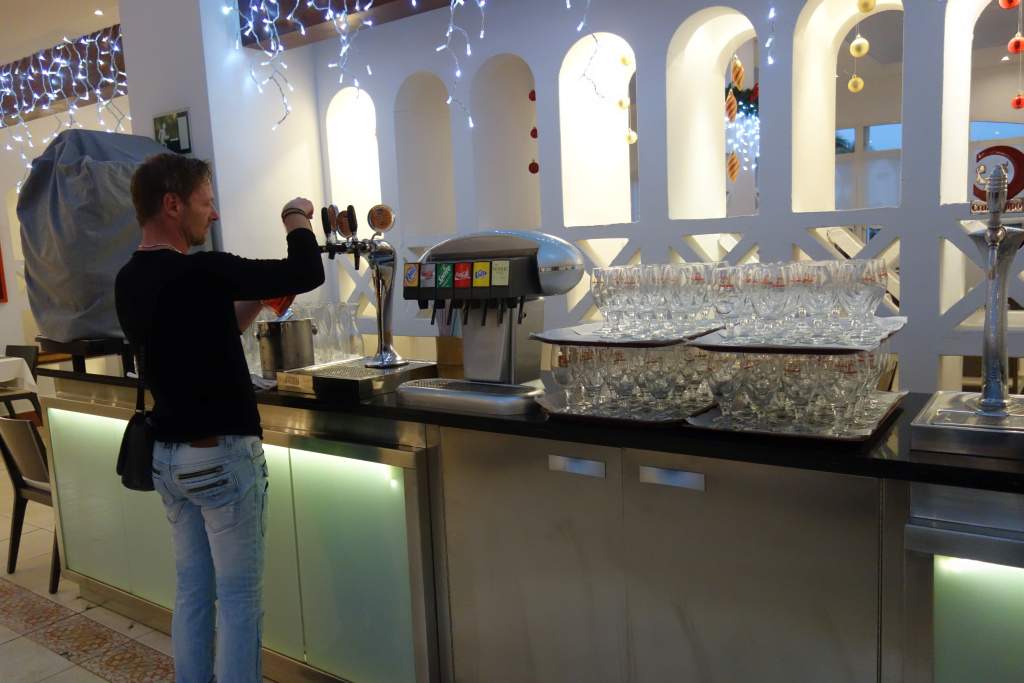 Am Abend wurde auch viel mehr getrunken als zu Hause üblich. Ich trank anfangs gespritzen Weißwein, sattelte aber bald auf Rotwein um. Zum Abschluss erlaubte ich mir auch mal einen erstaunlich guten lokalen Brandy, im Rotwein war einfach zu viel Wasser :-). Elke legte sich da nicht so fest, sie wechselte meist zwischen Rosewein, Sekt und Bier, probierte aber auch viele der angebotenen alkoholischen Cocktails. Der kostenlose alkoholische Ausschank endete um 23:00 Uhr, aber meist waren wir so müde, dass wir schon vorher im Zimmer verschwanden. Es war wohl auch unser Glück, dass es an den Bars keine Knabbereien wie Erdnüsse oder Chips gab, was wir manchmal bedauerten, aber sonst wären wir wohl noch schwerer zurückgekommen.