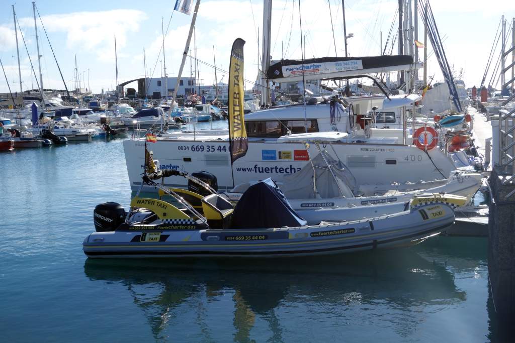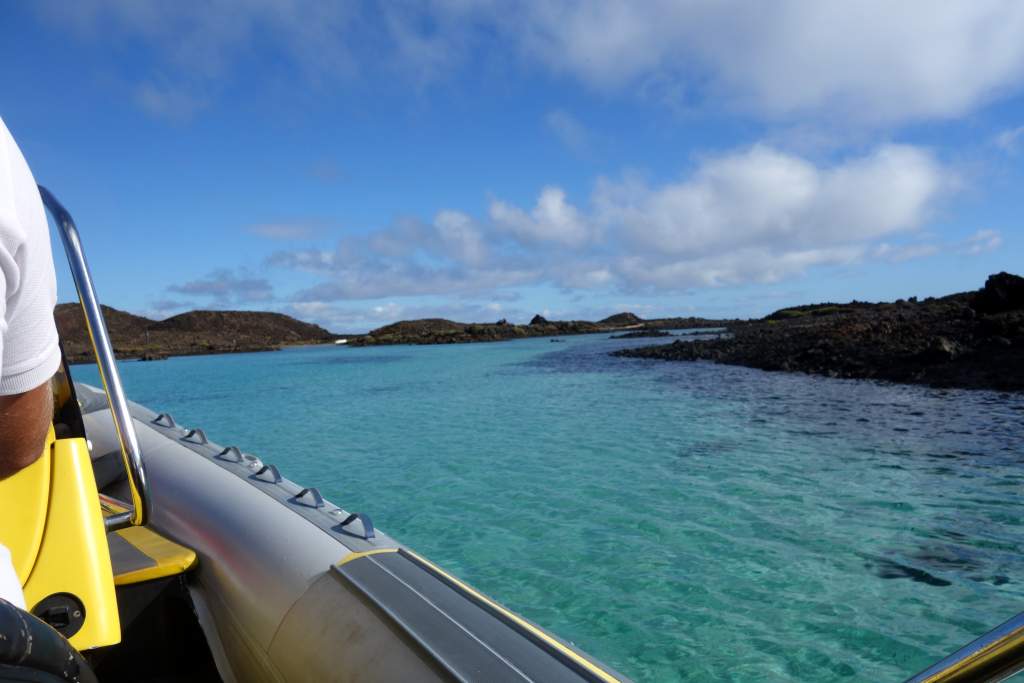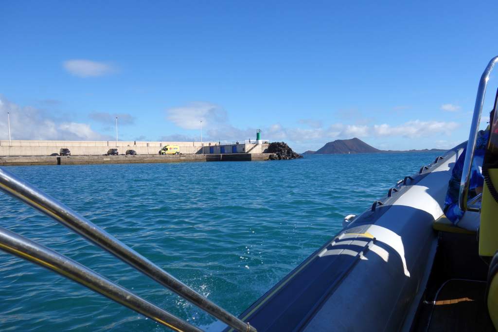 Direkt am Hafen gab es etliche Hüttchen, in denen die Anbieter ihre Tickets für die unterschiedlichen Möglichkeiten zur Überfahrt anboten. Wir wollten eigentlich die normale Fähre nehmen, die laut Internet fast stündlich verkehren sollte, aber deren Verkaufsstand war geschlossen. Die Betreiber des Wassertaxis versicherten uns glaubhaft, es gebe an diesem Samstag keine Fähre und so buchten wir für 15€ pro Person das Wassertaxi. Das große mit einem Außenbordmotor versehene Schlauchboot legte mit 3 weiteren Fahrgästen auch pünktlich um 10:30 Uhr ab, ganz wohl war uns aber wegen des etwas rauen Seegangs nicht, eine große Fähre wäre uns lieber gewesen. Die Werbebilder des Wassertaxis zeigten auch immer alle Teilnehmer in Schwimmwesten, diesen Umstand ersparte man sich bei uns aber.
