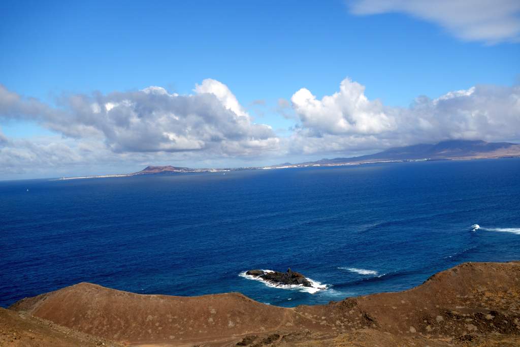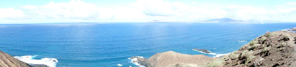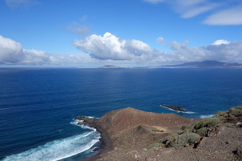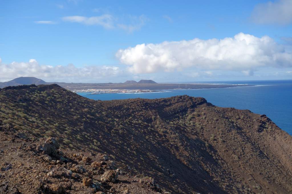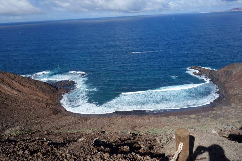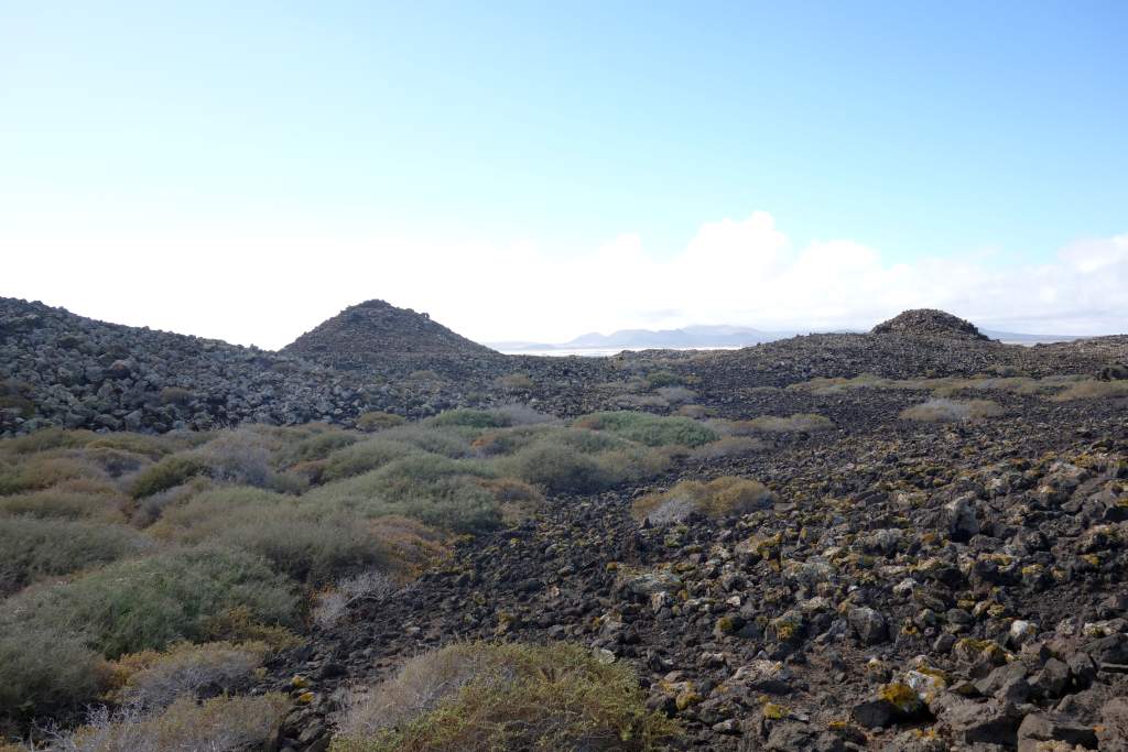 Die Bilder sprechen meines Erachtens für sich, daher wird der Wanderweg in der Ebene nicht weiter beschrieben. Das Erklimmen des etwas über 100m hohen Montana Caldera ist bei trockenem Wetter auf jeden Fall empfehlenswert. Der Aufstieg ist mit flachen Steinen ausgelegt, die an eine alte Straße mit Kopfsteinpflaster erinnern. Die Steigung ist ist allzu stark, wenn man mal von den letzten 100 Metern Gehweg absieht. Eine Gefahr des Abstürzens sehe ich unter normalen Umständen als unmöglich an, man fällt wohl schimmstenfalls hin, schlägt auf und bleibt liegen. Belohnt wird man durch einen grandiosen Rundblick, insbesondere auf die Nachbarinseln Fuerteventure und das 7km entfernte Lanzarote. Leider hatte Elke zu viel Angst, den Aufstieg zu wagen. So musste ich diesen tollen Rundblick alleine genießen, während Elke unten am Fuße des Hügels gelangweilt wartete. Echt schade, aber wer nicht wagt, der nicht gewinnt.
