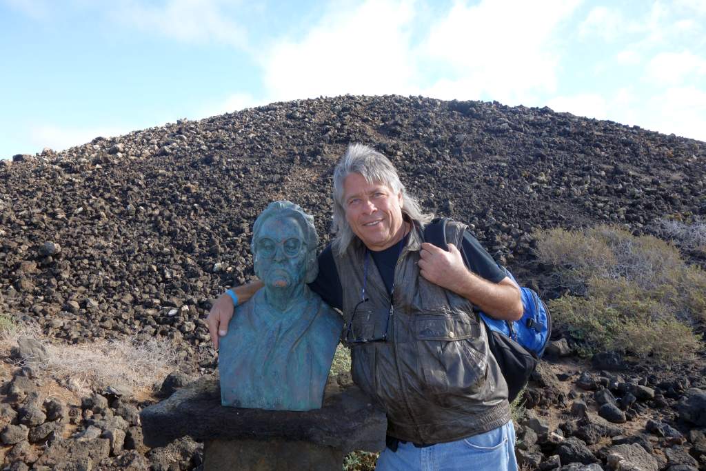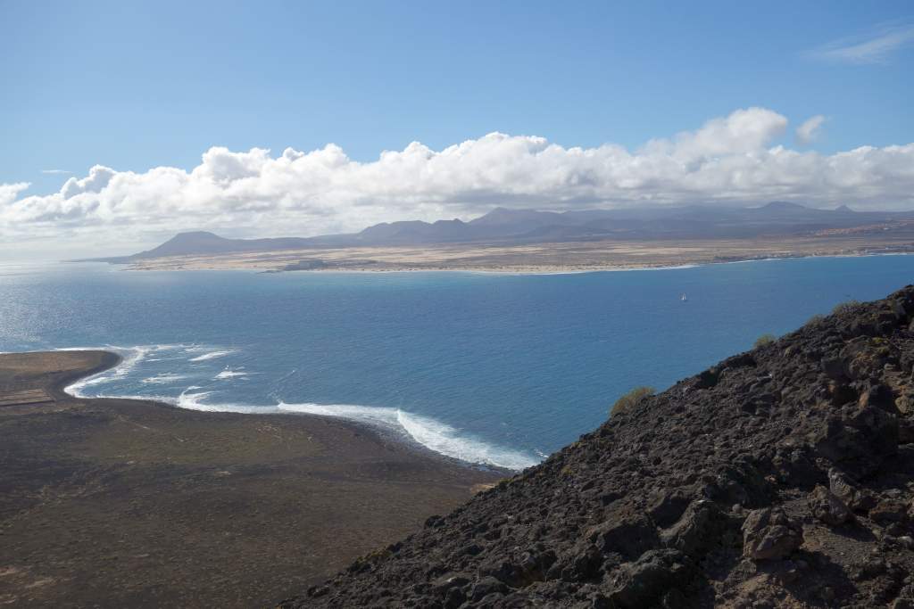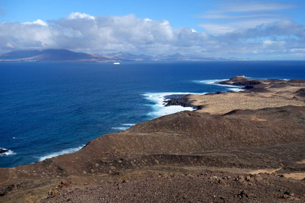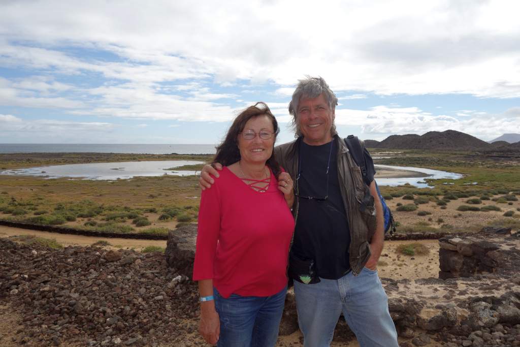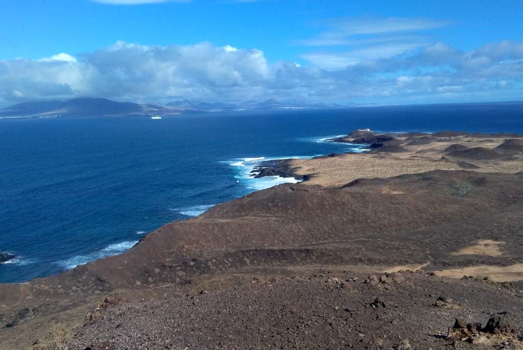 Die Bilder sprechen meines Erachtens für sich, daher wird der Wanderweg in der Ebene nicht weiter beschrieben. Das Erklimmen des etwas über 100m hohen Montana Caldera ist bei trockenem Wetter auf jeden Fall empfehlenswert. Der Aufstieg ist mit flachen Steinen ausgelegt, die an eine alte Straße mit Kopfsteinpflaster erinnern. Die Steigung ist ist allzu stark, wenn man mal von den letzten 100 Metern Gehweg absieht. Eine Gefahr des Abstürzens sehe ich unter normalen Umständen als unmöglich an, man fällt wohl schimmstenfalls hin, schlägt auf und bleibt liegen. Belohnt wird man durch einen grandiosen Rundblick, insbesondere auf die Nachbarinseln Fuerteventure und das 7km entfernte Lanzarote. Leider hatte Elke zu viel Angst, den Aufstieg zu wagen. So musste ich diesen tollen Rundblick alleine genießen, während Elke unten am Fuße des Hügels gelangweilt wartete. Echt schade, aber wer nicht wagt, der nicht gewinnt.