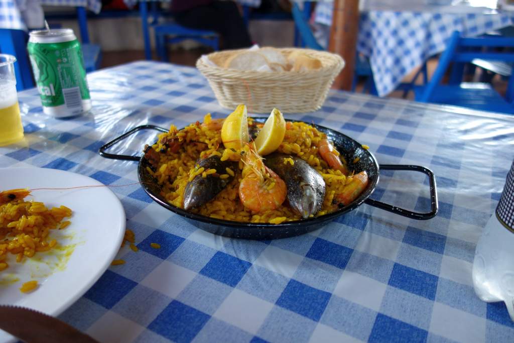Nach der erfolgreichen Umwanderung der Insel kamen wir gegen 14:00 Uhr wieder wohlbehalten an der Anlegestelle des Wassertaxis an. Wir gingen in die kleine Fischerkneipe, um die bestellte Paella zu verzehren. Es stellte sich heraus, dass die Portion riesig war und wir zu zweit Mühe hatten, die eine Portion für 7€ überhaupt zu schaffen. Auch die Grillfische an den Nachbartischen sahen super aus, 3 große Fische für 9€. Wir hatten noch 4 oder 5 Getränke und zahlten am Ende 14€ für alles, das war echt erstaunlich.