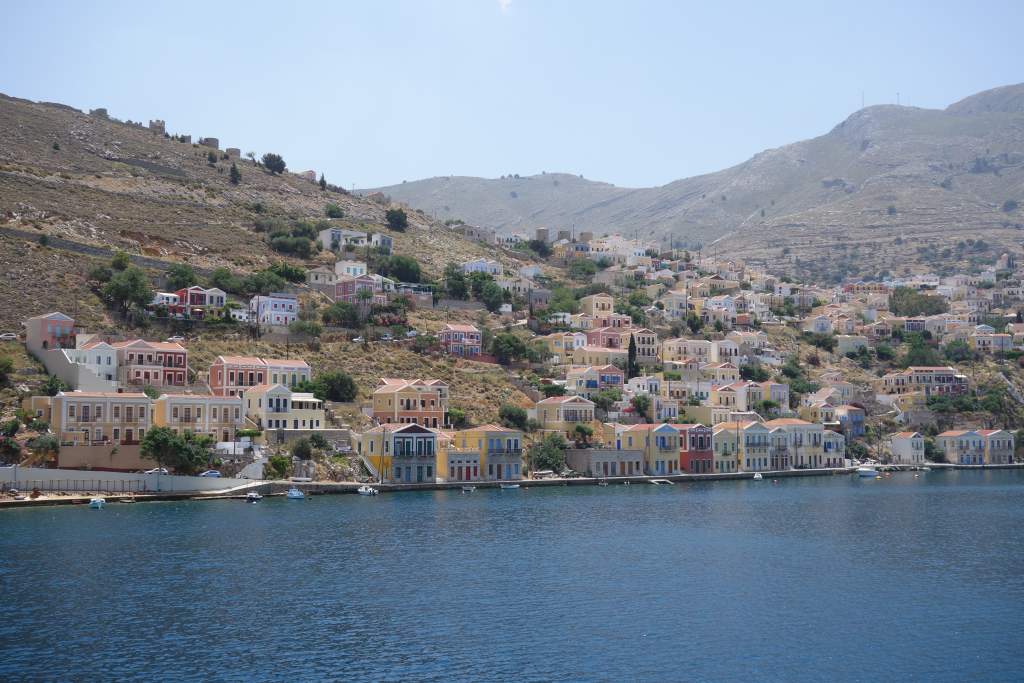 Für den anschließenden Aufenthalt in Symi Stadt blieben nicht viel mehr als 2,5 Stunden, genug, um ein wenig herumzulaufen und zu wenig, um wirklich etwas weiter weg zu gehen. Ich bin in westlicher Richtung auf der neben dem Strand liegenden Straße gelaufen und fand wunderschöne Stellen zum Baden, was ich auch ausnutzte. Der Ausblick war ebenfalls toll. Später ging ich zurück zum Hafen. Wie in allen Touristenorten sind die Erdgeschosse vollständig von Restaurants oder Geschäften mit Andenken belegt, nicht so mein Geschmack. Bekannt wurde Symi wohl durch Schwammtaucher und Schwämme findet man auch heute noch, aber die werden angeblich vollständig importiert, das es nahe der Insel keine mehr gibt.